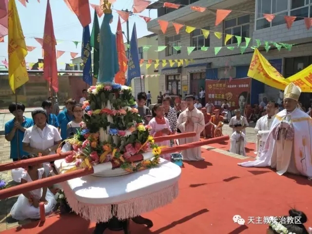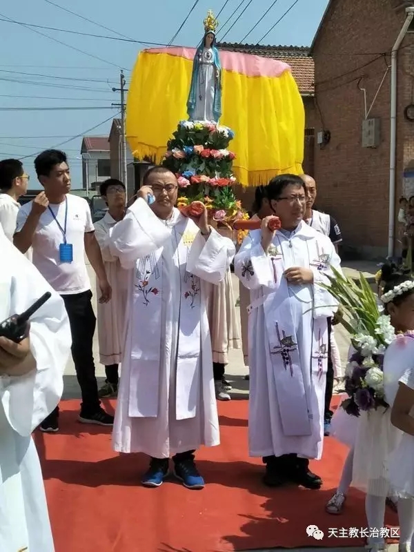 2017年7月13日,长治教区太和堂区隆重举行了圣母在法蒂玛显现100周年纪念活动。 上午九点半太和堂区彩旗飘飘,乐声隆隆,在教区丁主教的主持下开始了游行活动。游行活动着重突出法蒂玛圣母显现的主题,在太和村显要位置布置五处祭台,游行队伍每到一处安置好圣母像在主教的带领下恭诵玫瑰经,乐队和唱经班奏唱法蒂玛圣母歌,全体神父教友手持念珠虔诚地跪拜在圣母面前在炎炎烈日下恭诵玫瑰经的《光明五端》,游行队伍庄严整齐,游行气氛庄严而热烈。