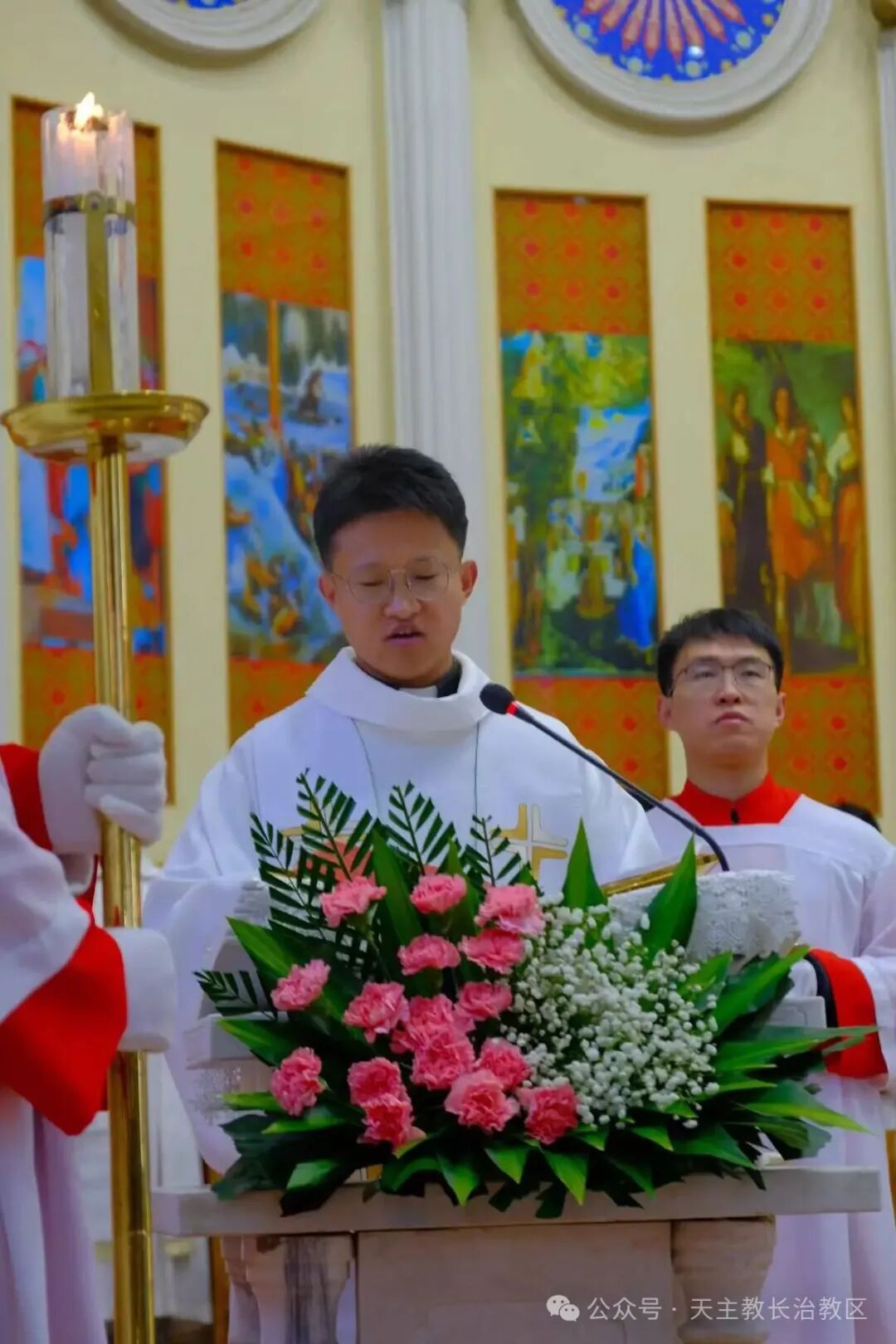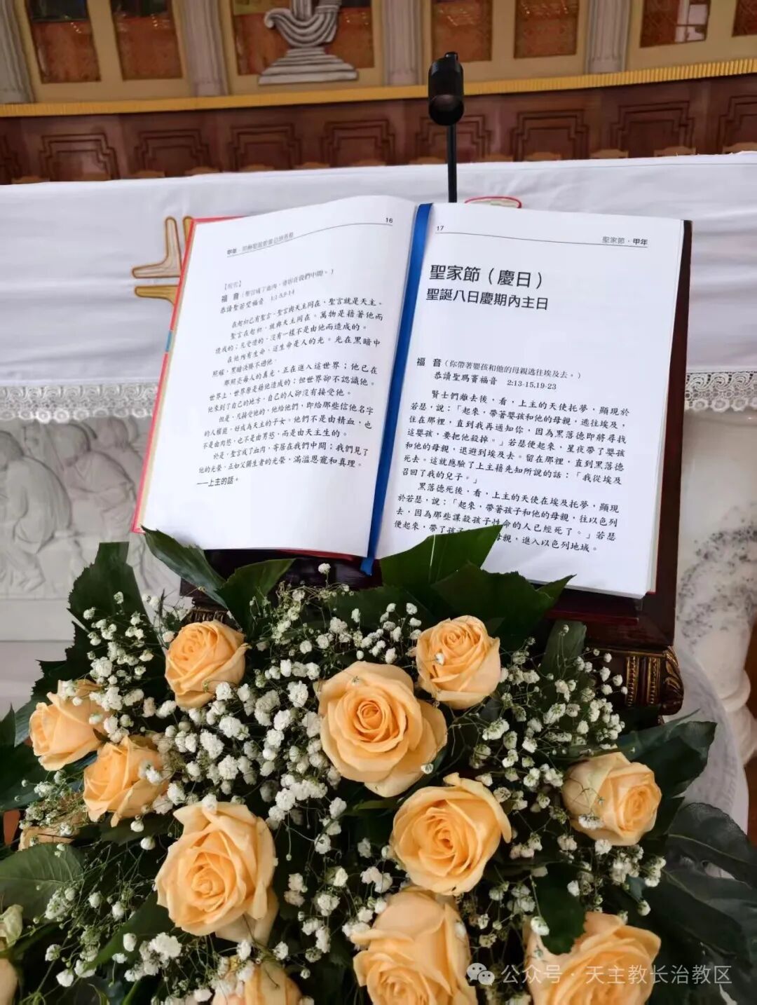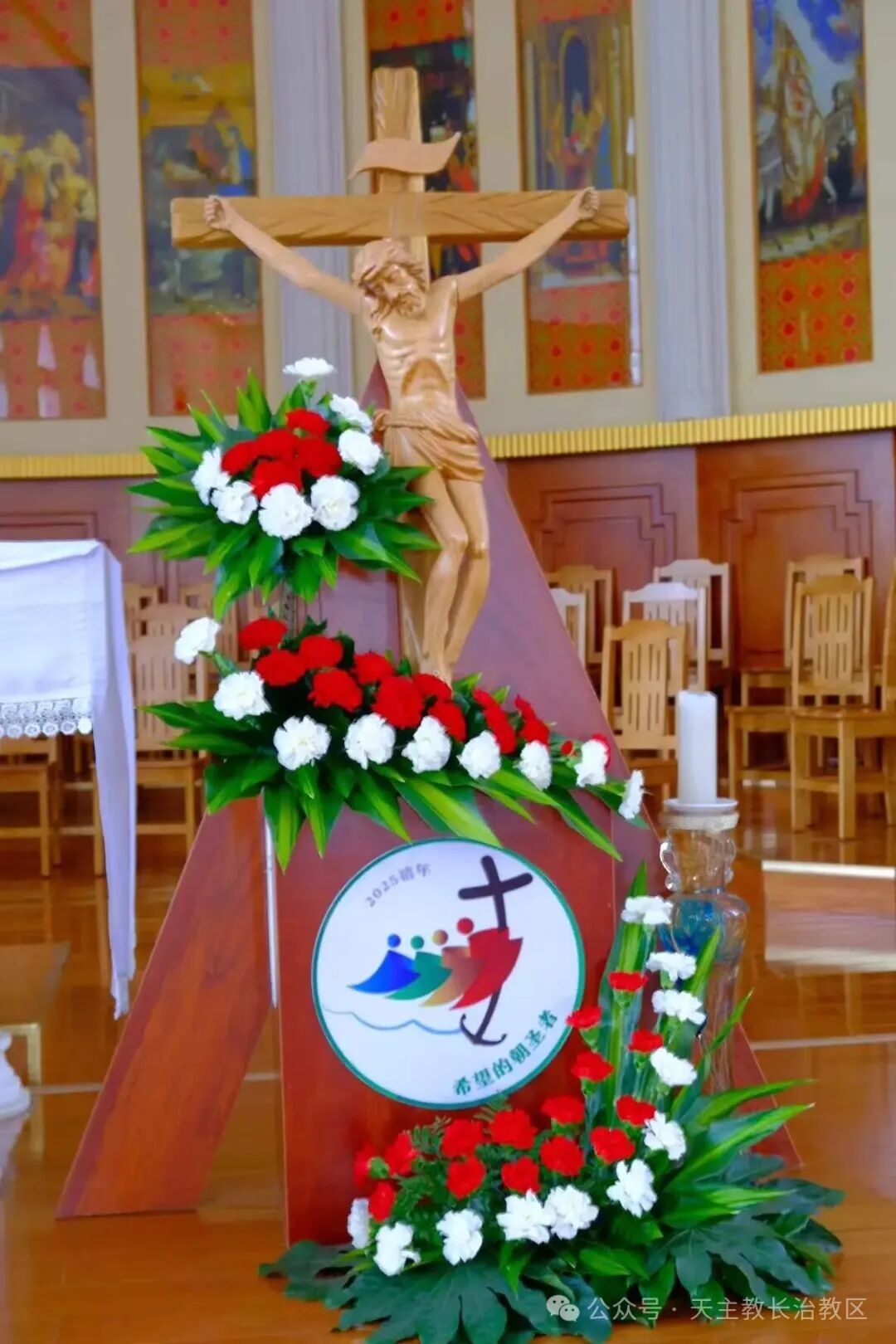 祭台之上,禧年十字架被缤纷的鲜花簇拥,熠熠生辉,让天主恩宠的光芒愈发耀眼夺目。